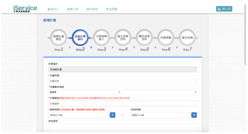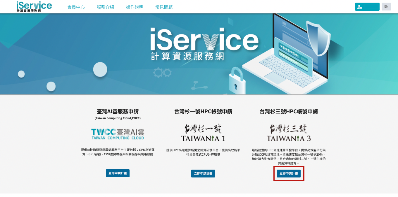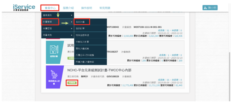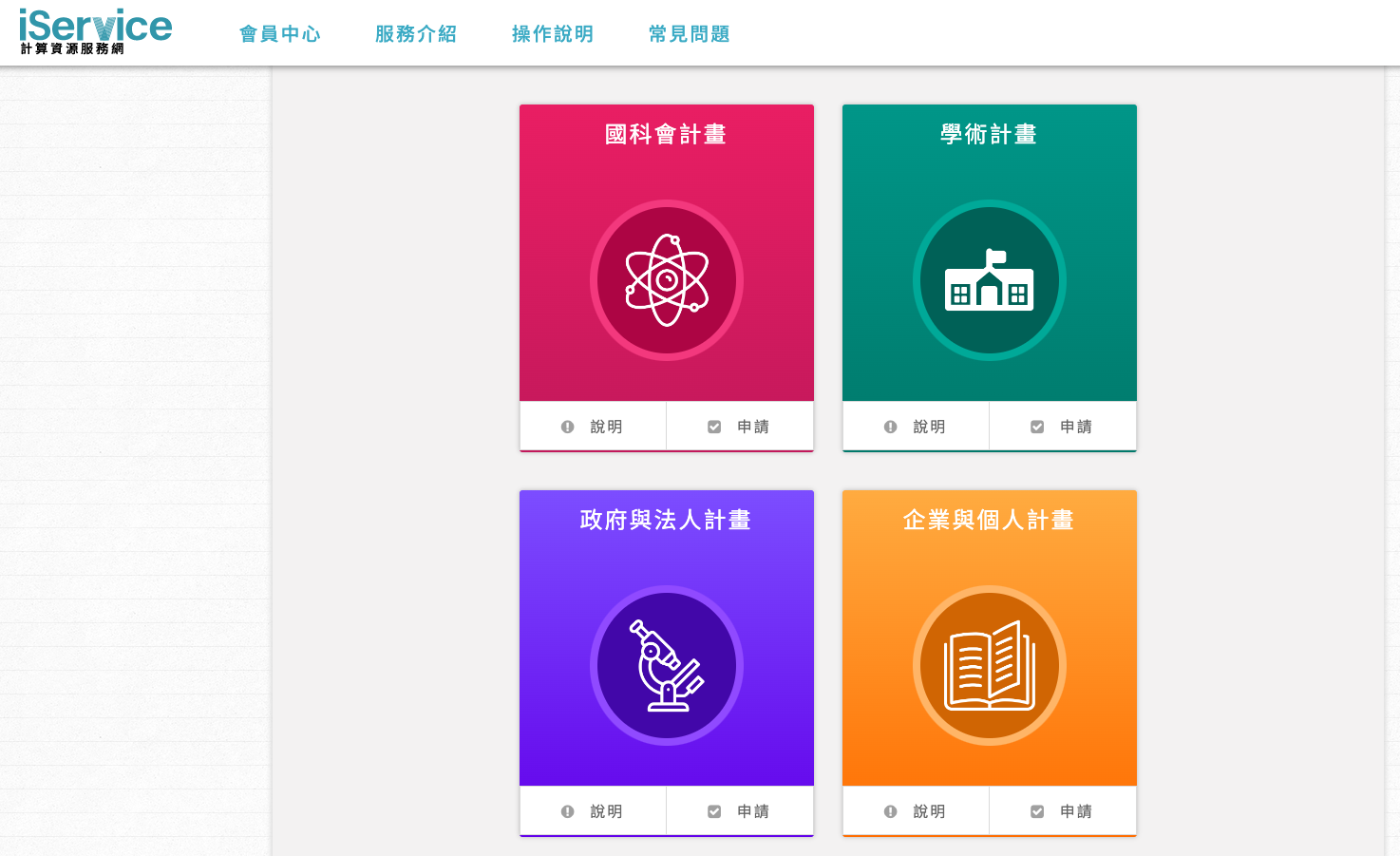 - 計畫的「審核狀態」將會顯示在 [iService 會員服務系統](https://iservice.nchc.org.tw/nchc_service/index.php)(會員中心 > 我的計畫)請等待國網中心審核,審核通過後計畫狀態將顯示「申請通過」