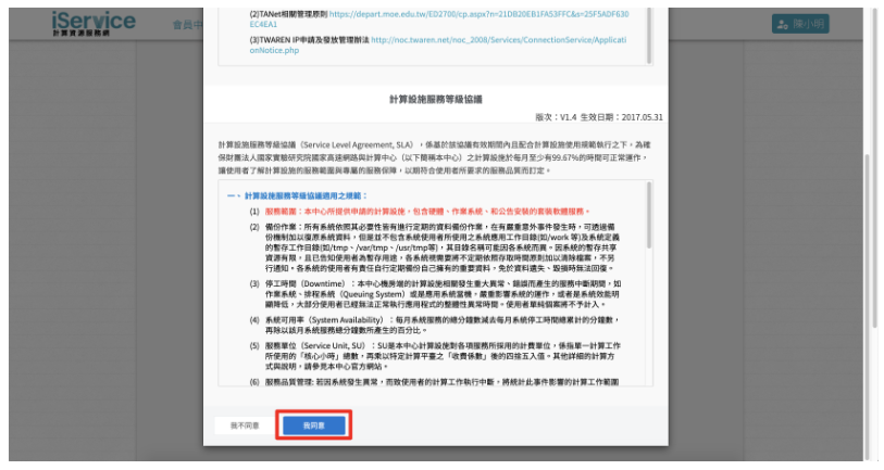 - 閱讀國網中心平台服務條款、計算設施服務等級協議後,下拉頁面,點選「我同意」