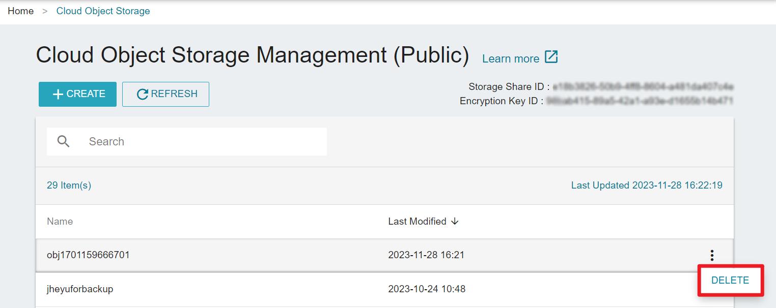 * Select "Cloud Object Storage" from the service list, enter the cloud object storage management page, and click "+CREATE".