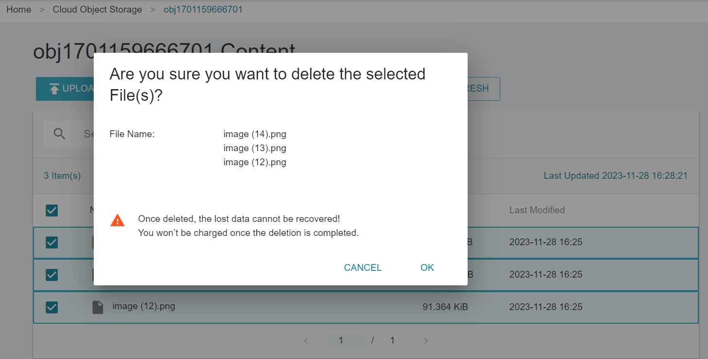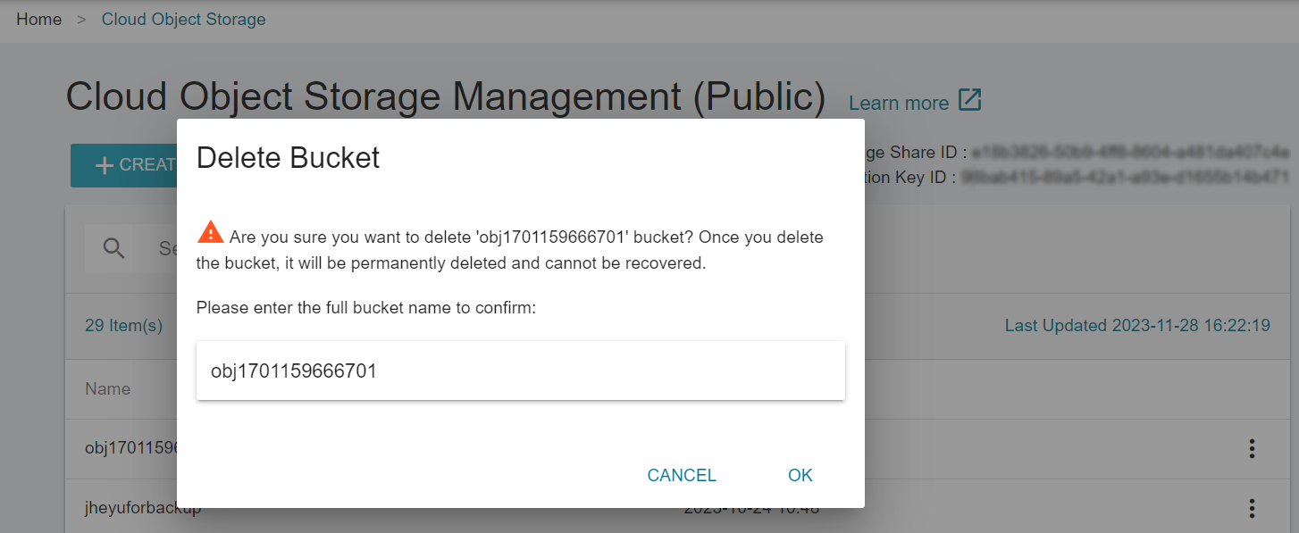 * Once the bucket is deleted, all the data in the bucket will be deleted and cannot be restored. To avoid accidental deletion, you must enter the name of the bucket to confirm.
