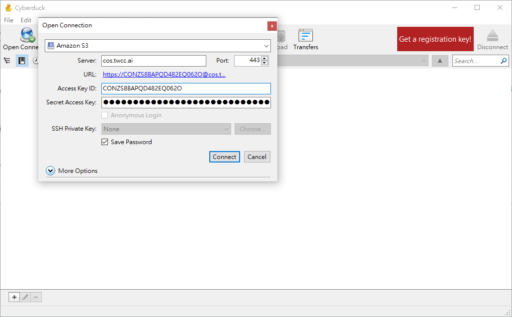 * As shown in the figure below, set the connection information of the TWCC cloud object storage account. The host type of the connection must be "Amazon S3", and then follow the connection information provided by the third-party software download page to set the server (cos.twcc.ai), Access Key ID and Secret Access Key.