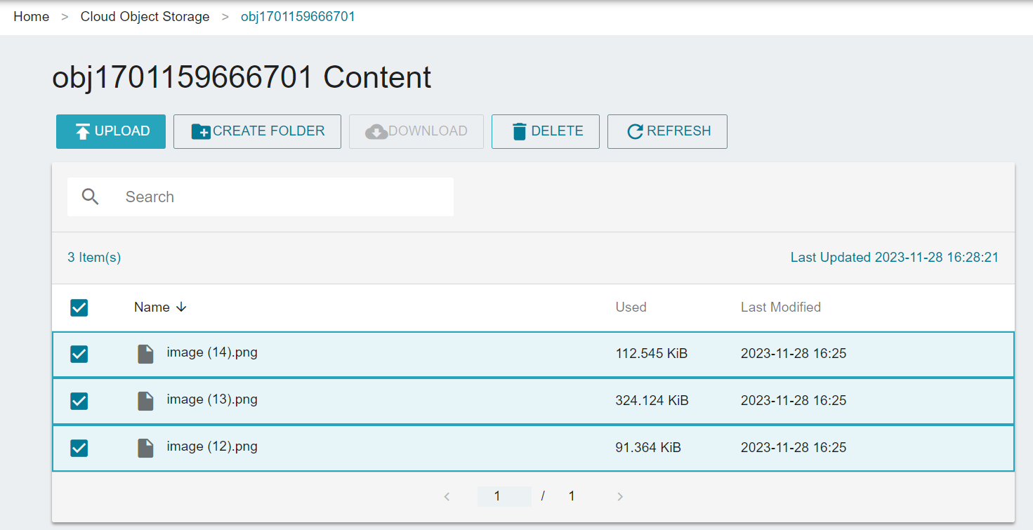 * On the bucket details page, select the file you want to download and click the "Download" button at the top of the list.