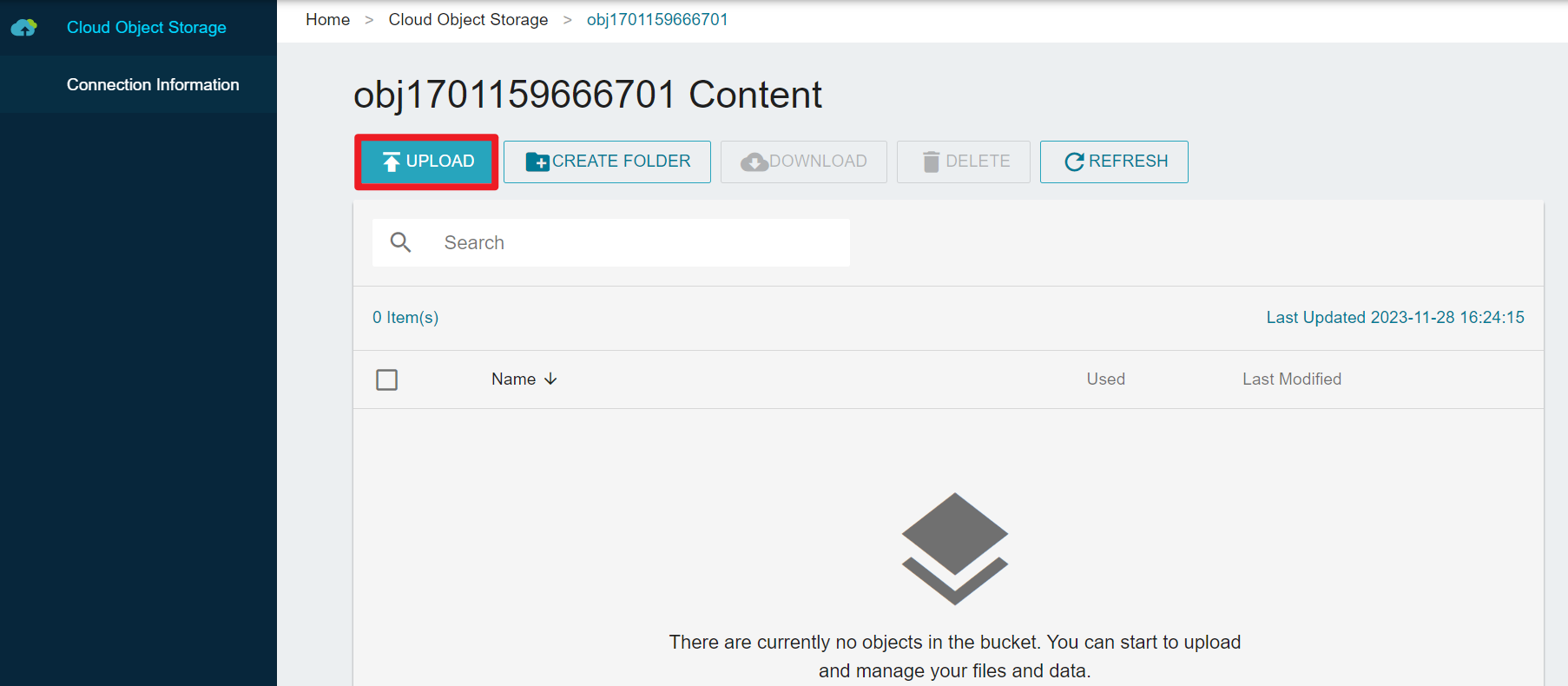 * On the bucket details page, click “Upload”.