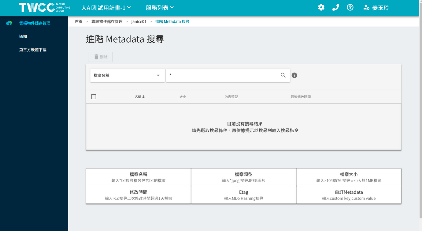TWCC Cloud Object Storage provides two ways to search for files: A general search box and an advanced metadata search unique to the bucket.