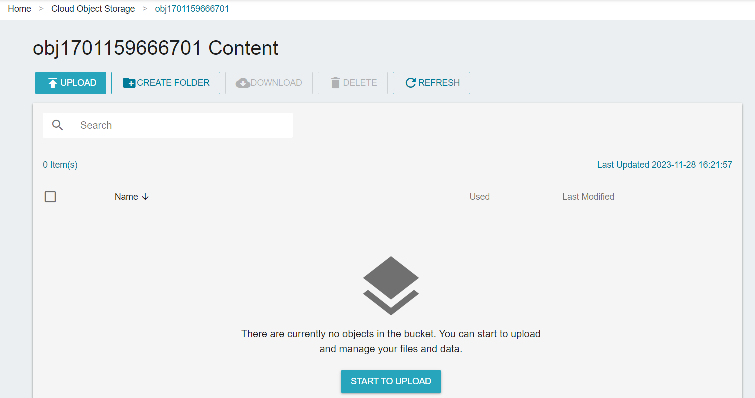 * When the bucket is created, it will show on the top of the list. Click the list to enter the bucket details page and begin to use it.