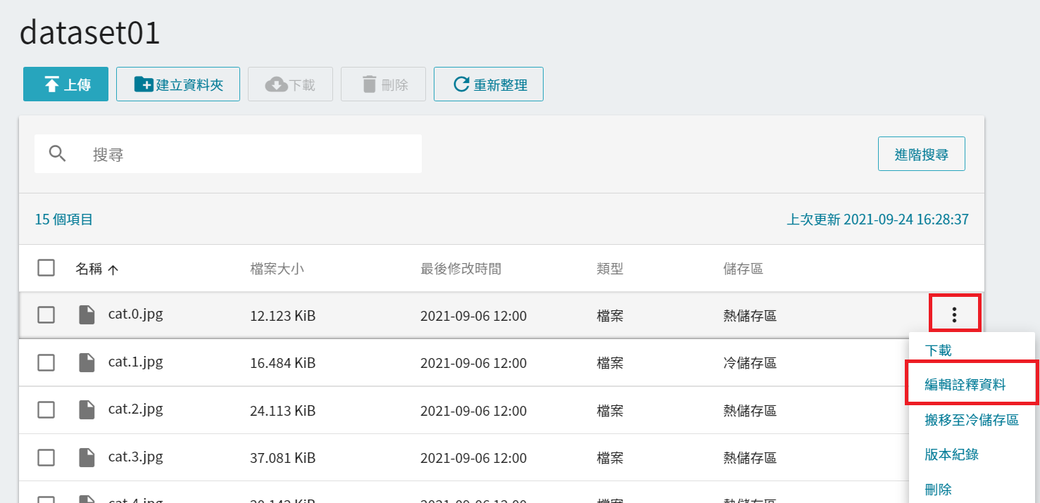 * 在資料集的內容列表頁面,將滑鼠移至檔案列表右側的 <i class="fa fa-ellipsis-v fa-20" aria-hidden="true"></i> 選單按鈕,再點選「**編輯詮釋資料**」。