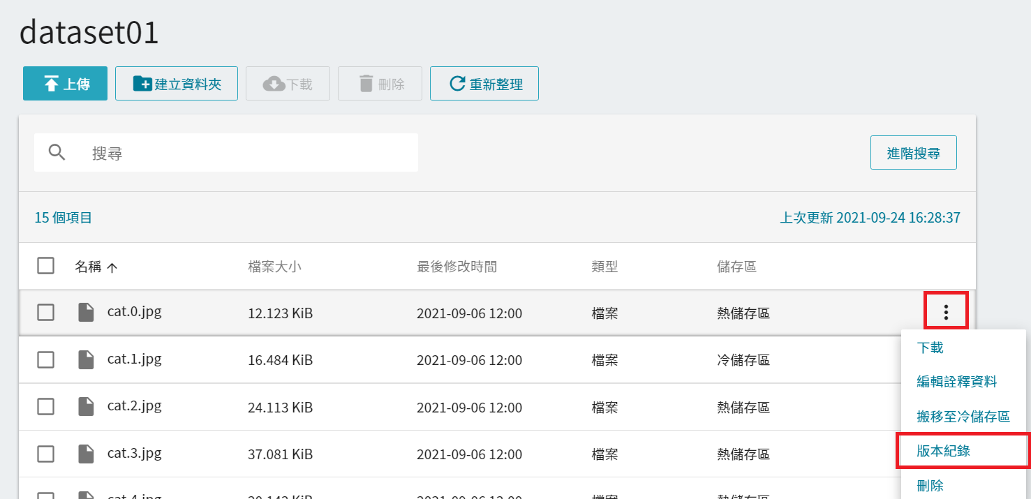 - 上傳與冷儲存區相同檔名之檔案:新檔案將會儲存於熱儲存區,並顯示於檔案儲存管理頁;原檔案仍儲存於冷儲存區,可點選右側於版本紀錄檢視/取用。